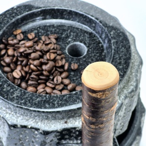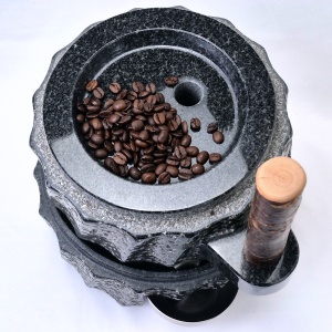 The stone used is an exceptionally rare "premium black granite." This stone is characterized by its lack of crystalline grains and its higher specific gravity compared to other granites. With prolonged use, coffee beans' oils can leave stains on the millstone. However, due to the deep black color of the stone, such stains are barely noticeable. The exterior design is divided into 16 equal sections around the circumference, forming a twisted rhombus shape. The surface is textured with a chisel to represent the waves of the Amakusa Sea, and then further refined and polished to reflect light. This process results in a subtle reflection across the entire surface, and the irregular chisel marks give it a unique and distinctive appearance. The upper millstone is designed to hold enough beans for two servings (approximately 20g) at a time. However, it can be used repeatedly to grind larger quantities without generating heat that could cause "bean scorching." (Exposure to extreme heat is said to increase bitterness in coffee.) The diameter of the grinding surface was determined through trials to ensure sufficient grinding capacity without over-grinding, and it is set at 5.0 sun (approximately 15 cm). The height of the upper millstone was calculated based on the necessary weight. The lower millstone features a donut-shaped groove around the outer edge of the 5.0 sun (15 cm) grinding surface. This groove is 8-9 bu wide (24-27 mm) and 5 bu deep (15 mm), designed to collect the ground coffee. The donut-shaped groove has a single "hole," through which the ground coffee is swept by a "brush" attached to the underside of the upper millstone. With each rotation, the coffee falls through the hole into the groove. The "hole" in the lower millstone is crafted to accommodate a "tray," with an opening measuring 10 cm wide, 10 cm deep, and 6 cm high. This design determines the height of the lower millstone.