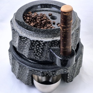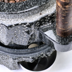 A brush, hidden beneath the handle of the upper millstone, collects the ground powder during rotation. The powder is automatically deposited into a container through a hole in the groove designed to catch it. When grinding coffee beans, a small amount of powder may scatter. To prevent this, the grinding surface is recessed below the outer edge of the powder groove. This requires precise machining, but it effectively minimizes powder scattering around the millstone. Note: For matcha millstones, there is no powder scattering, so the grinding surface does not require this recessed design.