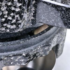 Subtle steps are built into the lower edges of both the upper and lower millstones.