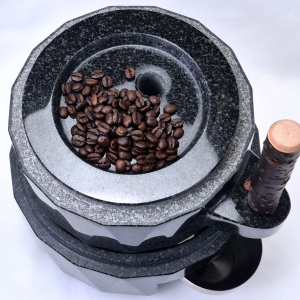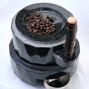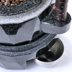 A brush, hidden beneath the handle of the upper millstone, collects the ground powder during rotation. The powder is automatically deposited into a container through a hole in the groove designed to catch it. When grinding coffee beans, a small amount of powder may scatter. To prevent this, the grinding surface is recessed below the outer edge of the powder groove. This requires precise machining, but it effectively minimizes powder scattering around the millstone. Note: For matcha millstones, there is no powder scattering, so the grinding surface does not require this recessed design.