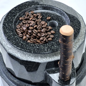 The stone used is an exceptionally rare "premium black granite." This stone is characterized by its lack of crystalline grains and its higher specific gravity compared to other granites. Over years of use, the oil from coffee beans may leave stains on the millstone, but the deep black color of the stone makes these barely noticeable. The entire surface is crafted into triangular facets to create a complex interplay of light reflections. The design is inspired by the gently rippling water surface that only appears during calm seas in the inner waters of Amakusa. The upper millstone is designed to hold enough beans for two servings (approximately 20g) at a time. However, it can be used repeatedly to grind larger quantities without generating heat that could cause "bean scorching." (Exposure to extreme heat is said to increase bitterness in coffee.) The diameter of the grinding surface was determined through trials to ensure sufficient grinding capacity without over-grinding, and it is set at 5.0 sun (approximately 15 cm). The height of the upper millstone was calculated based on the necessary weight. The lower millstone features a donut-shaped groove around the outer edge of the 5.0 sun (15 cm) grinding surface. This groove is 8-9 bu wide (24-27 mm) and 5 bu deep (15 mm), designed to collect the ground coffee. The donut-shaped groove has a single "hole," through which the ground coffee is swept by a "brush" attached to the underside of the upper millstone. With each rotation, the coffee falls through the hole into the groove. The "hole" in the lower millstone is crafted to accommodate a "tray," with an opening measuring 10 cm wide, 10 cm deep, and 6 cm high. This design determines the height of the lower millstone.
