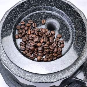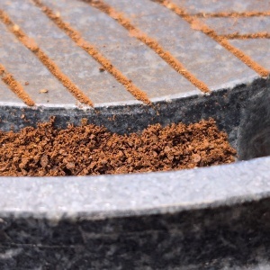 Today’s beans push yesterday’s grounds out of the stone mill.