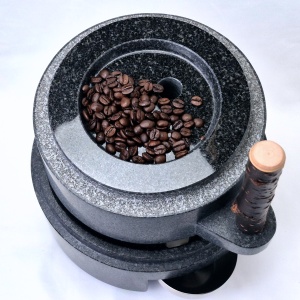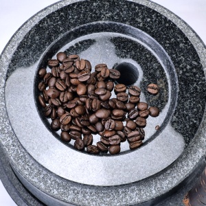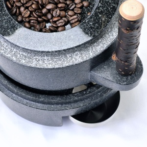 石臼には長年の使用による珈琲豆の油分の染み込みでシミが出来ますが、真っ黒な石材のためにほとんど気になりません
