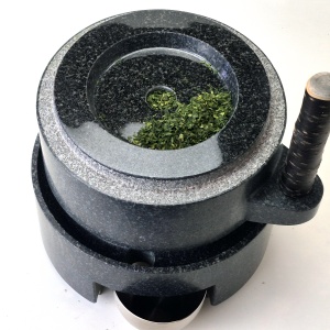 私の抹茶臼は挽きたい量の茶葉を全部入れてあとは上臼を回し続けるだけで微細な抹茶を挽く設計です