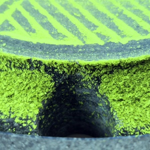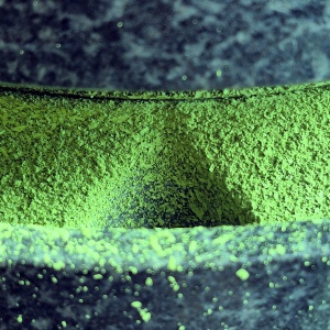 石臼から挽き出された抹茶は溝に溜まり、