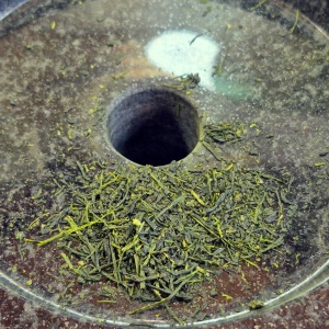 碾茶を挽く場合は、最初に茶葉をすべて穴へ入れてから回し始める。